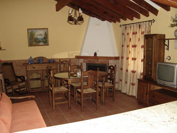Salón comedor con chimenea de leña, aire acondicionado con bomba de calor y frio, tv, juegos de mesa y cristalería.