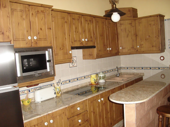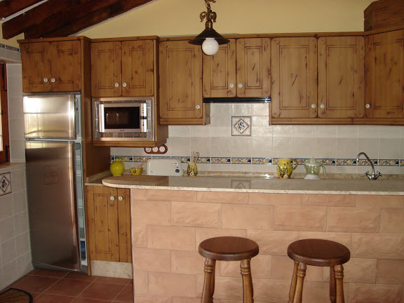 Cocina con barra americana, frigorífico grande, microondas, placa vitrocerámica, tostador, exprimidor eléctrico, batidora, cafetera, olla expres, sartenes, cubiertos y todos los utensilios necsarios en una cocina.