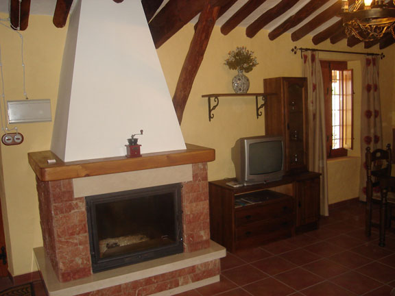 Salón comedor con chimenea de leña, aire acondicionado con bomba de calor y frio, tv, juegos de mesa y cristalería.